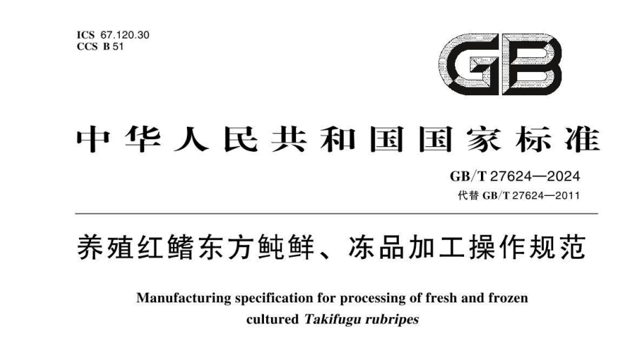 国家标准GB/T27624-2024《养殖红鳍东方鲀鲜、冻品加工操作规范》正式发布