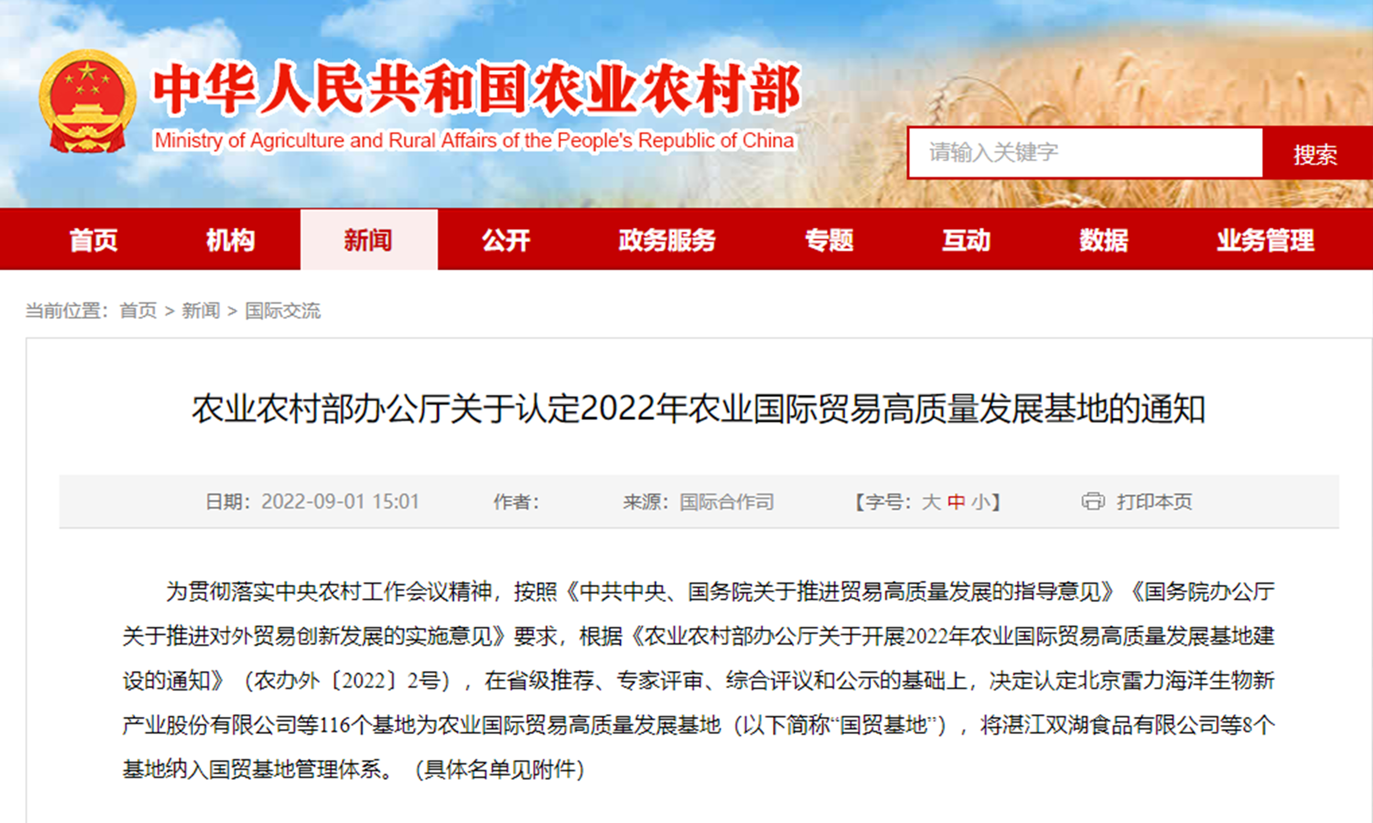 9月1 日,农业农村部办公厅关于认定江南jiangnan(中国)实业为2022年农业国际贸易高质量发展基地的通知。